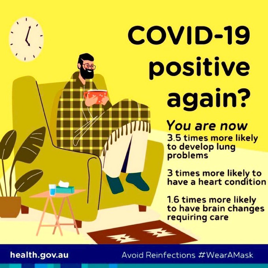 In sharp contrast to the situation in many other countries there seems to be a normalisation in the minds of politicians at least, of the idea of everyone repeatedly catching a virus that doubles or sometimes trebles your chance of diabetes, stroke, heart attack, autoimmune disorder, and various symptoms known as ‘long Covid’ more each time you catch it. The fact that this massively increases the number of people unable to work, reduces life expectancy by several years, damages all sectors of the economy, and continues to bring the NHS to its knees seems not to have registered with the government nor the main opposition. Read the poster below from Australia and reflect on the differences from the UK approach. Also see an article from the US – What doctors wish patients knew about Covid-19 reinfection.