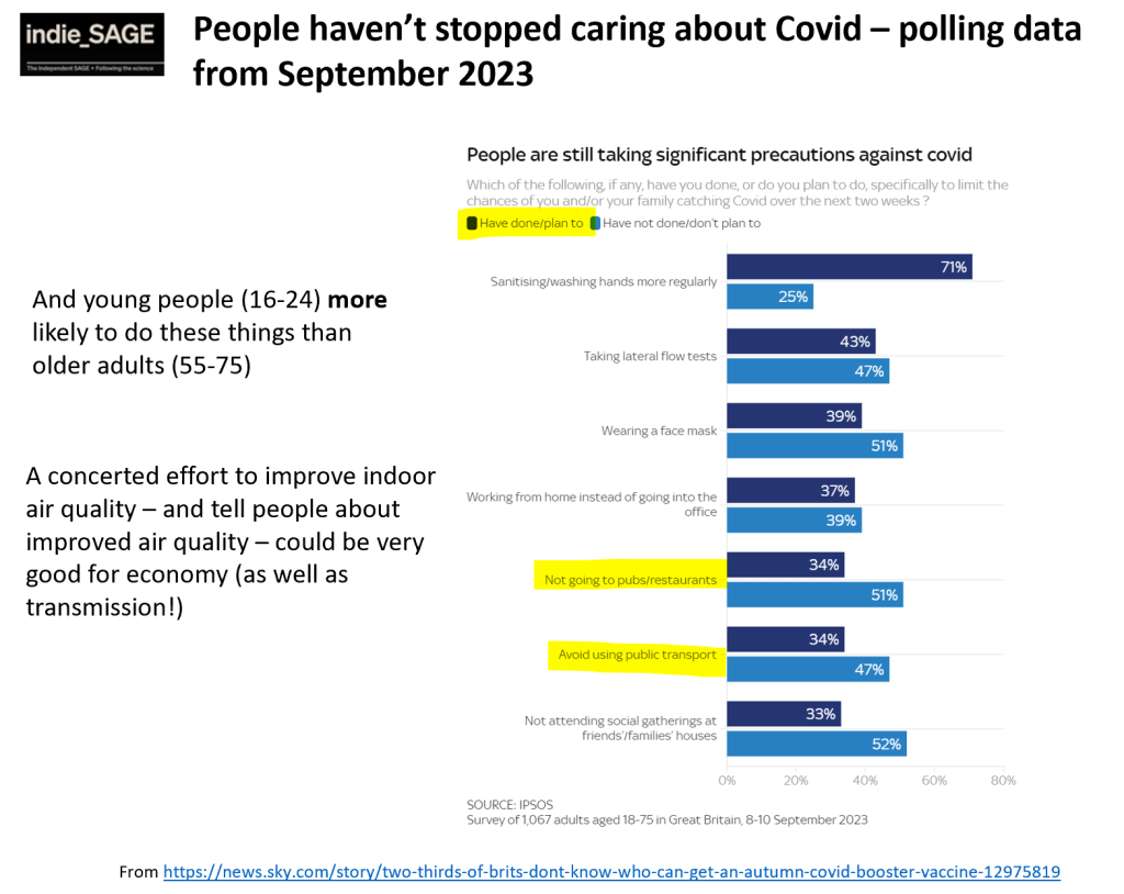 Thirdly, that it shows that if we could support safer indoor spaces (primarily through ventilation and air purification) we could not only reduce transmission but also support the economy by enabling more people to feel comfortable in restaurants, pubs, theatres etc. (I know a number of households, not all of them clinically vulnerable, that can relate to this and wish we lived in countries such as Belgium, that do take Covid seriously.)