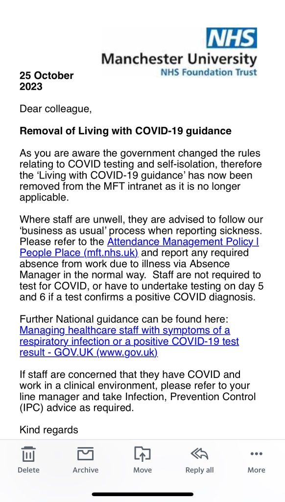 However, these good examples are in the minority at the moment. In sharp contrast, in Manchester health authority have taken it upon themselves to almost discourage staff testing for Covid and have implemented a sick leave policy in line with any other staff illness. This completely ignores the highly transmissibility of Covid via the air and the fact that unlike flu type droplets it can hang about in the air for hours.