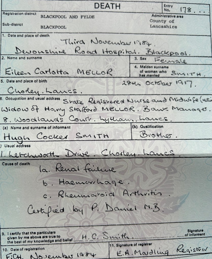 Eileen was training as a nurse at Blackpool at the time of her father’s (Hugh Gillibrand Elijah Smith) illness in September 1936, and was present at his death at 1 Letchworth Drive, Chorley.