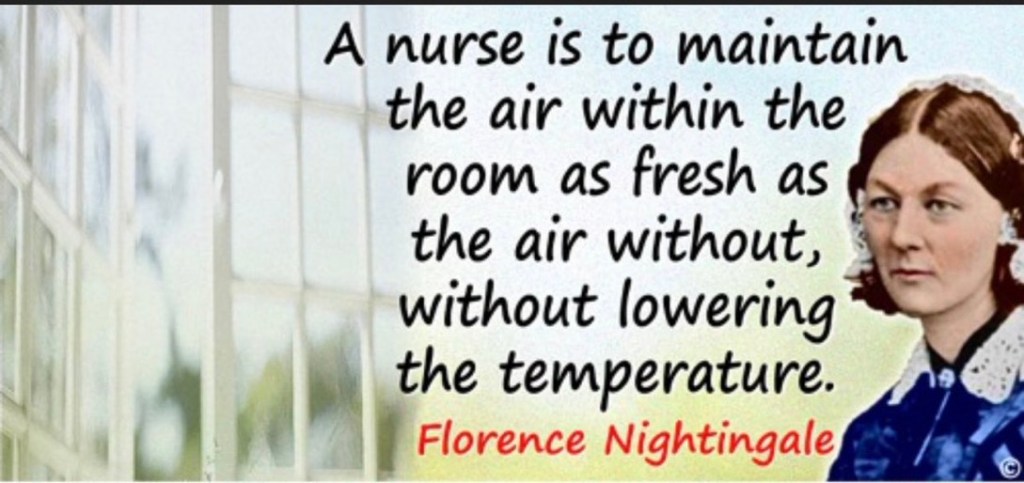 This basis for nursing was established by Florence Nightingale who back in 1859 was championing fresh air and called for the air inside the hospital ward to be as clean as the air outside through improved ventilation and air flow.