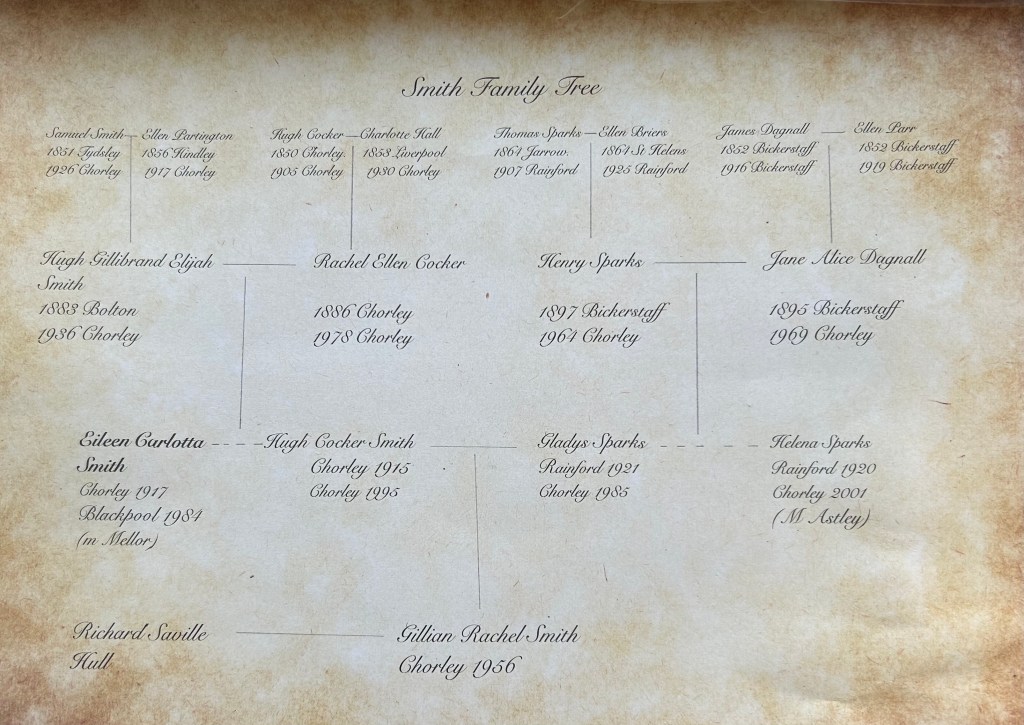 Rachel and Hugh Gillibrand Elijah Smith’s second child and Hugh Cocker Smith’s only sister (and hence first aunt to Gillian), Eileen Carlotta, was born in Water St, Chorley, Lancashire on 28 October 1917.