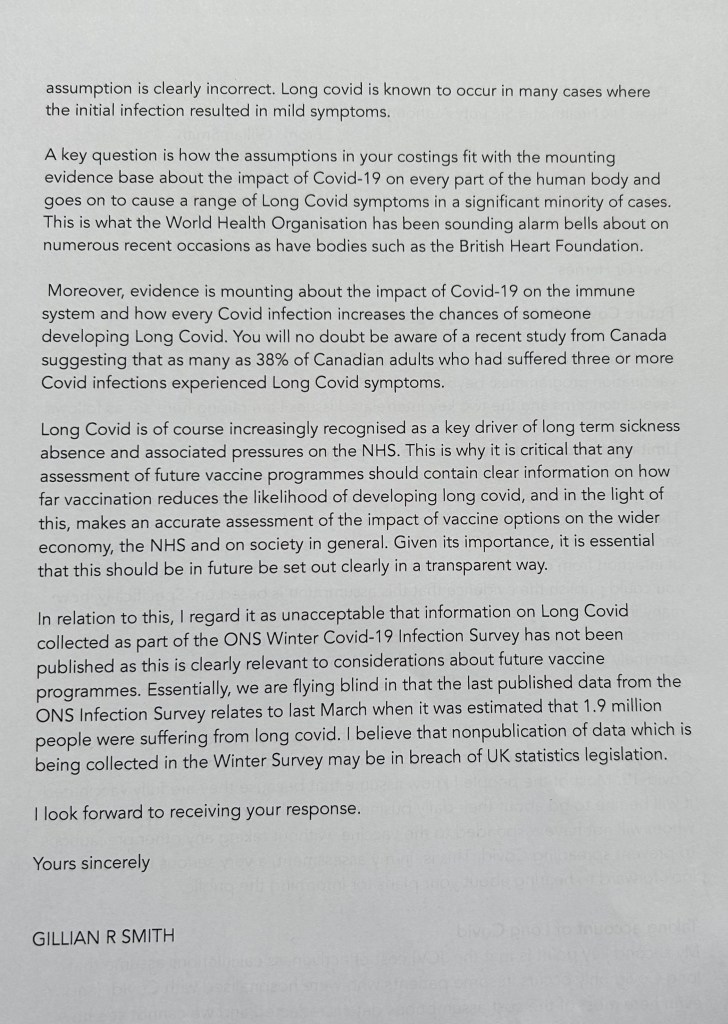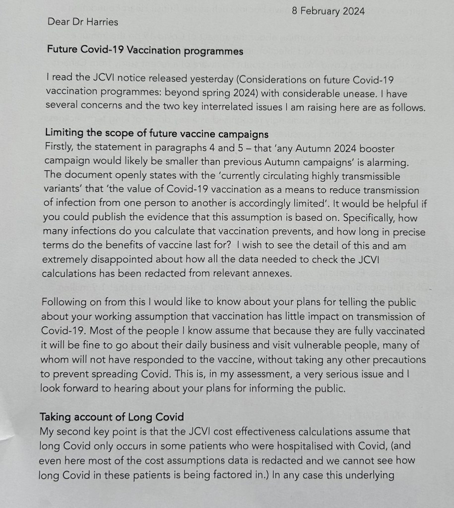 I have sent a letter to Jenny Harries head of UKHSA the body which is responsible for the JCVI cover the first two of these points. This is self explanatory.