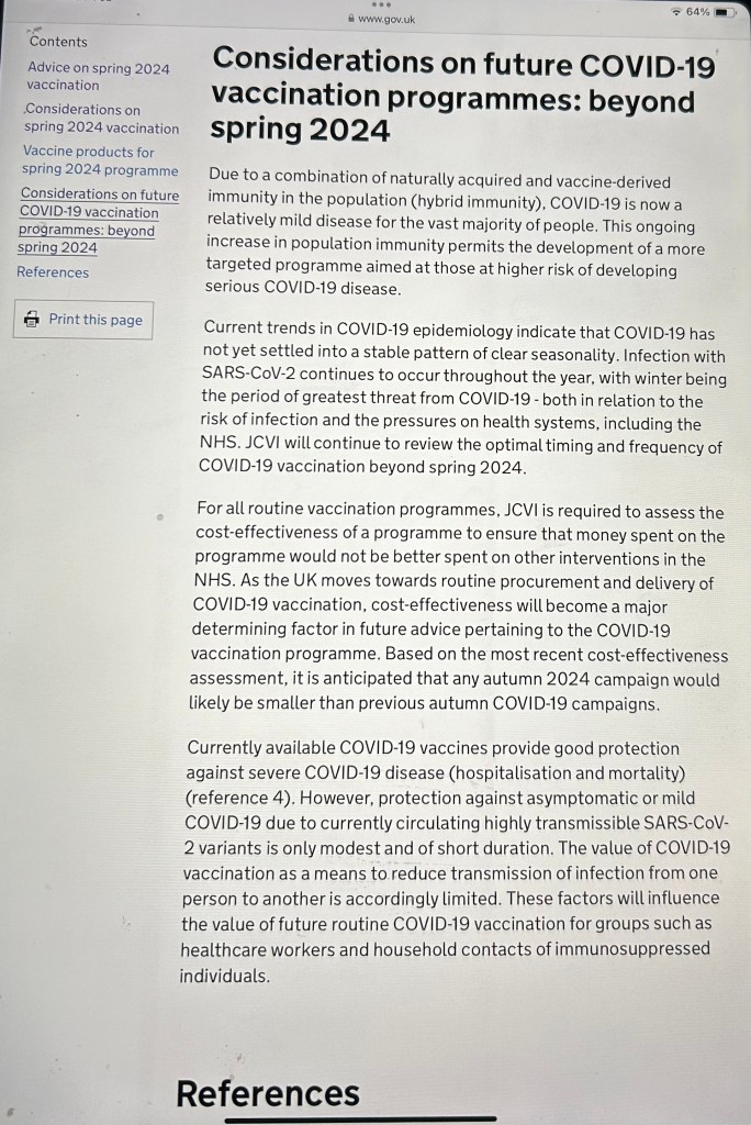 The really alarming news comes later in the document reprinted below. Namely that ‘cost effectiveness will become a major determining factor and based on the most recent cost-effectiveness assessment, it is anticipated that any autumn 2024 campaign would likely be smaller than previous autumn COVID-19 campaigns.’