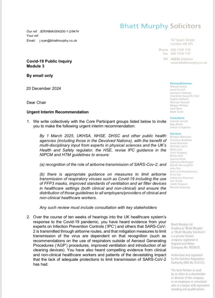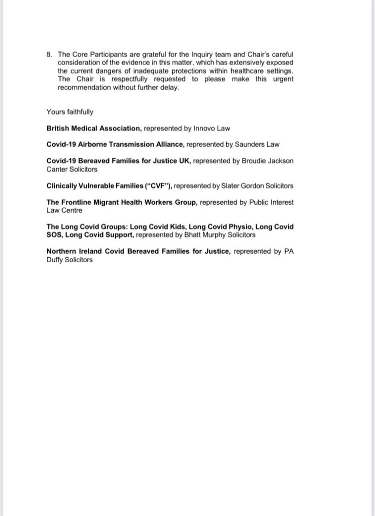 It remains to be seen whether the chair is prepared to make any urgent interim findings and recommendations of the type called for by CATA (Covid Airborne Transmission Alliance) and supported by the CVF group and other core participants. Specifically the IPC (Infection Protection and Control) cell guidance needs to be changed and this needs to happen quickly.
