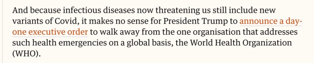 The actions of President Trump to date are deeply worrying. In particular, the day one order to pull the USA out of the World Health Organisation. This action has attracted numerous adverse commentary including from former Foreign Secretary, David Miliband and former Prime Minister Gordon Brown who outlines the wrongheadedness of the decision in a world where global co-operation needs to increase. Specifically on Covid, he comments: