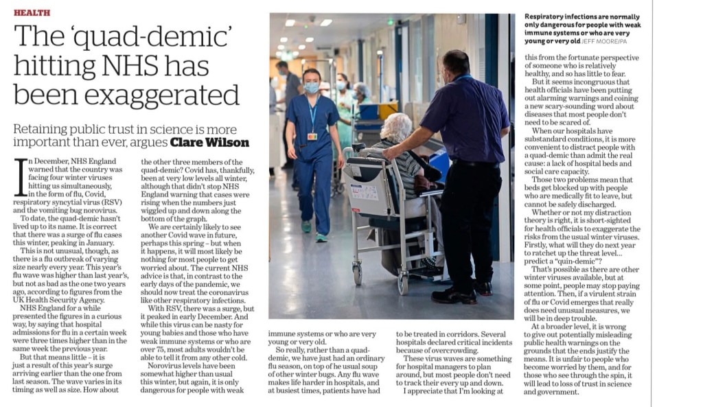 “In her piece ‘The quad-demic hitting NHS has been exaggerated’ Clare Wilson acknowledges that we will probably see another Covid wave, possibly in the spring, but she goes on to say it’s nothing for most people to get worried about and we should now treat it like other respiratory infections.