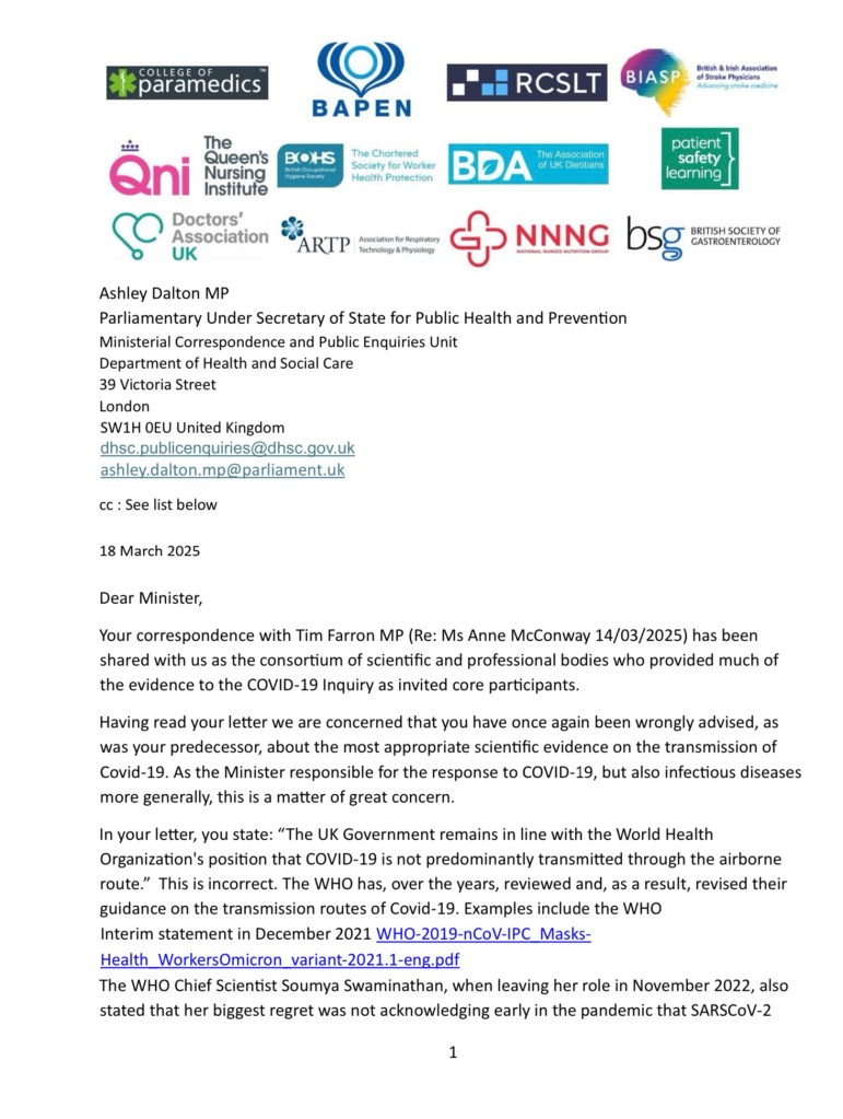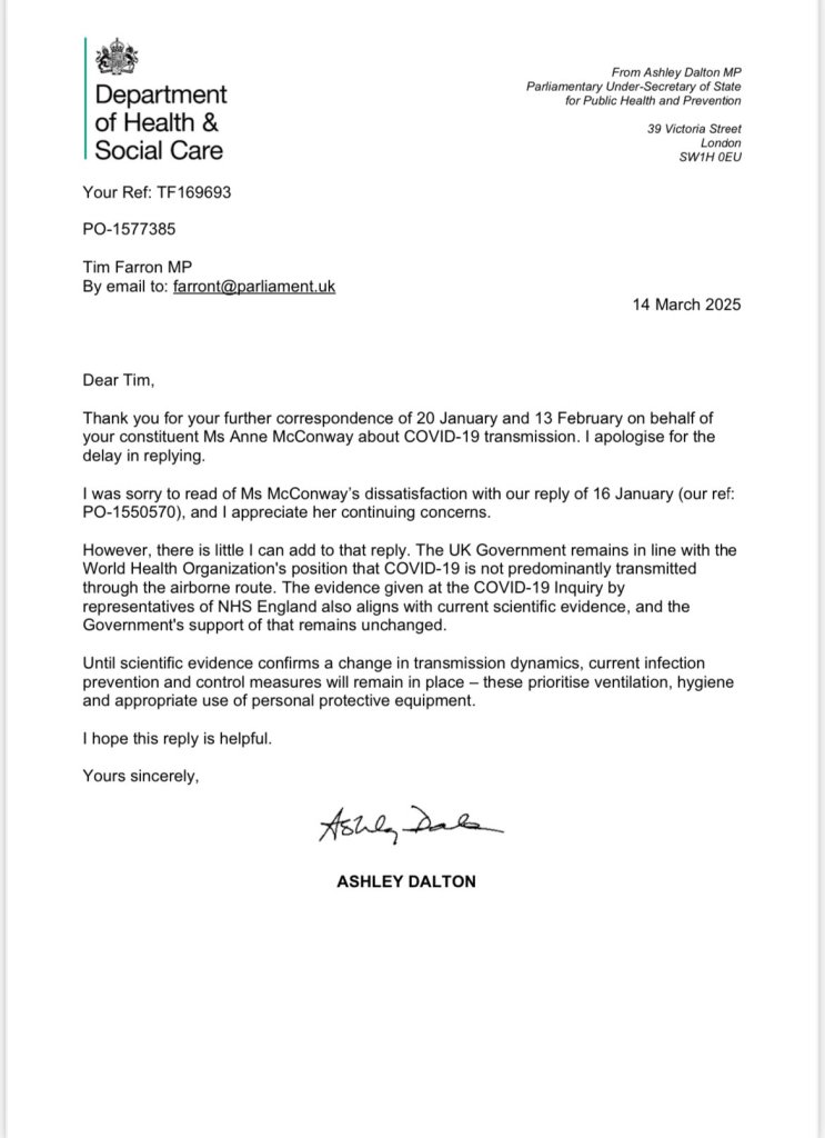 The new Minister for Public Health, Ashley Dalton replied (on 11 March 2025) to Tim Farron’s letter to Andrew Gwynne (see previous blog). This appeared to take a different and more serious stance than the previous reply from Gwynne. Whilst the letter does not provide everything we might wish for in terms of a commitment to revising the IPC guidance, and is not entirely accurate in that it understates the importance of air borne transmission, in the words of one commentator ‘it appears that the government advisors have been doing some reading’. See letter below.