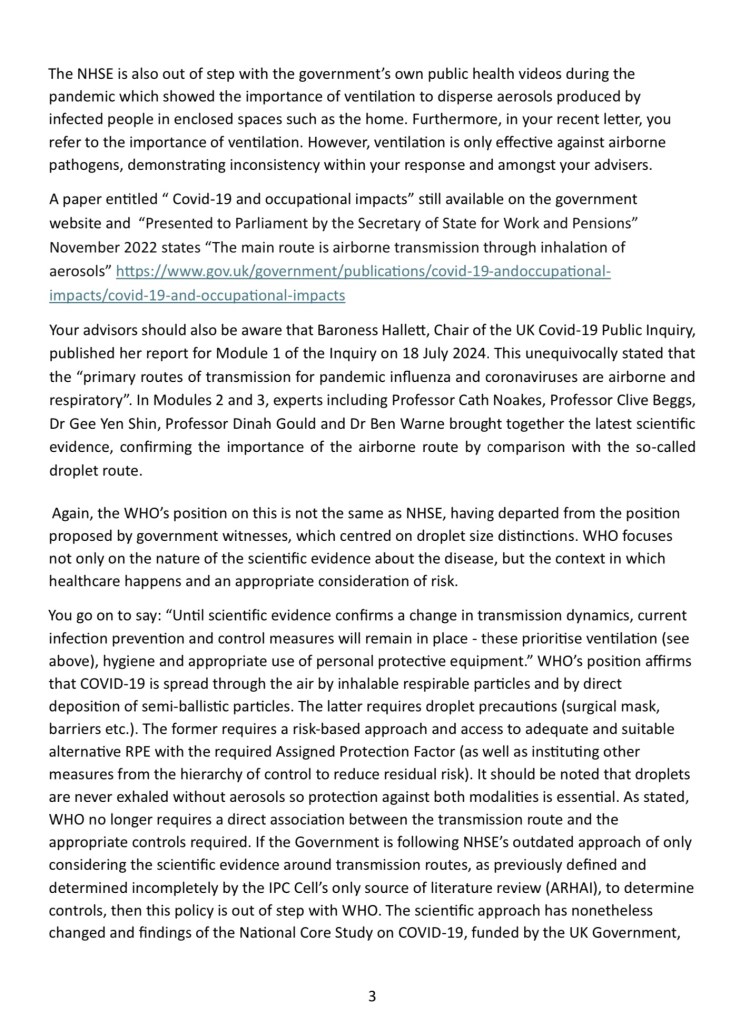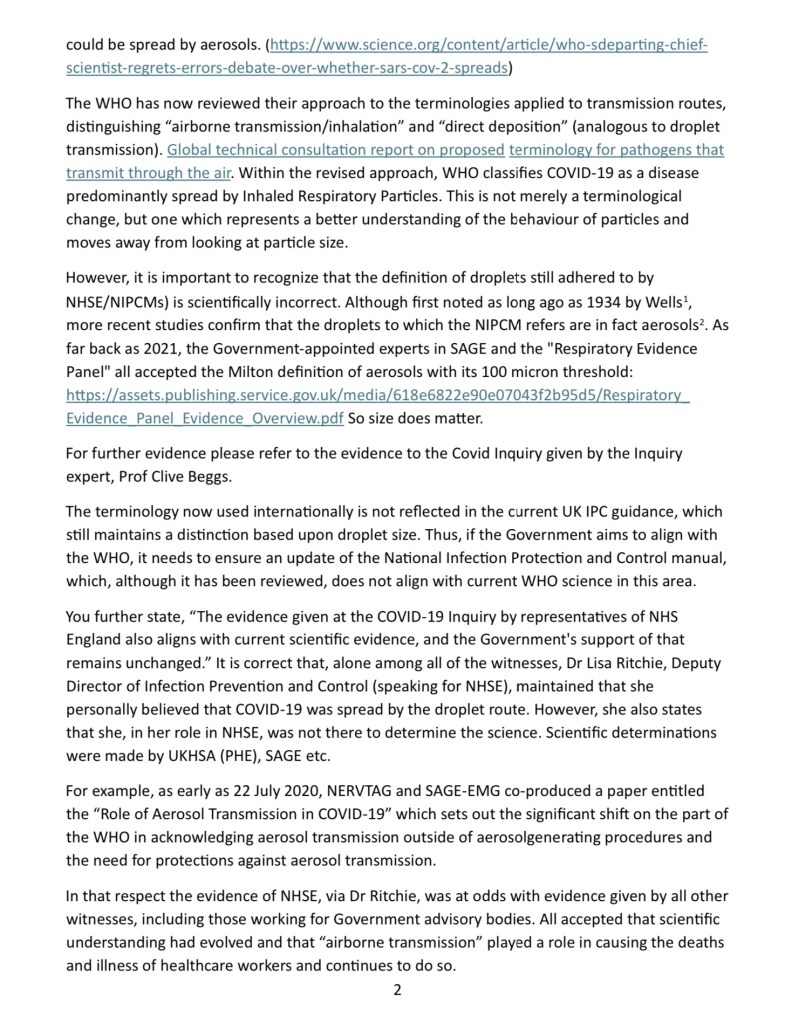 • The definition of and focus on droplets still used by NHS England is therefore out of step with these developments. Indeed, the evidence given to the Covid Inquiry by NHS England through Lisa Richie (mentioned in the letter to Dalton) was at odds with what every other witness said;