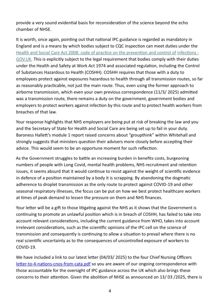 • CATA point out that there remains a duty on government, government bodies and employers to protect health care workers from transmission via this route, as the IPC guidance is mandatory and underpinned by health and safety laws;