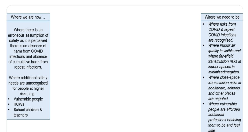 The column to the right – where we need to get to. Again, there is nothing new or surprising here and it is what groups such as CVF have been striving for, including a recognition of airborne transmission and implementation of measures such as ventilation and air filtration in healthcare settings, schools and other places etc and where the needs of clinically vulnerable people and their households are recognised and addressed .