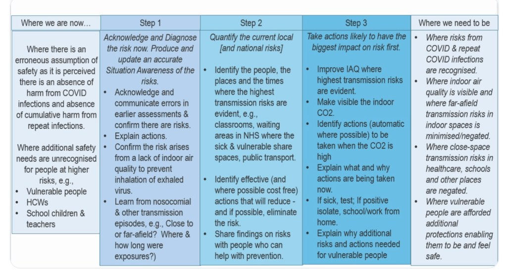 Actions here include being frank and upfront about the mistakes made from the start of the pandemic, particularly around how Covid transmits and the missed opportunities to improve indoor air quality. I would place explaining why measures to improve air quality centre stage in this step 1.