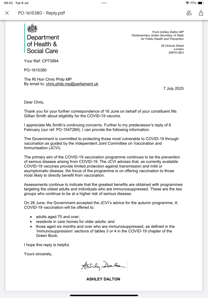If we do not continue to fight this there will without doubt be even more restrictions placed on who is entitled to free boosters next year and beyond. I have, for example, seen a previous JCVI paper which models (no details) restricting boosters to people over 80 and immunosuppressed people over 45.