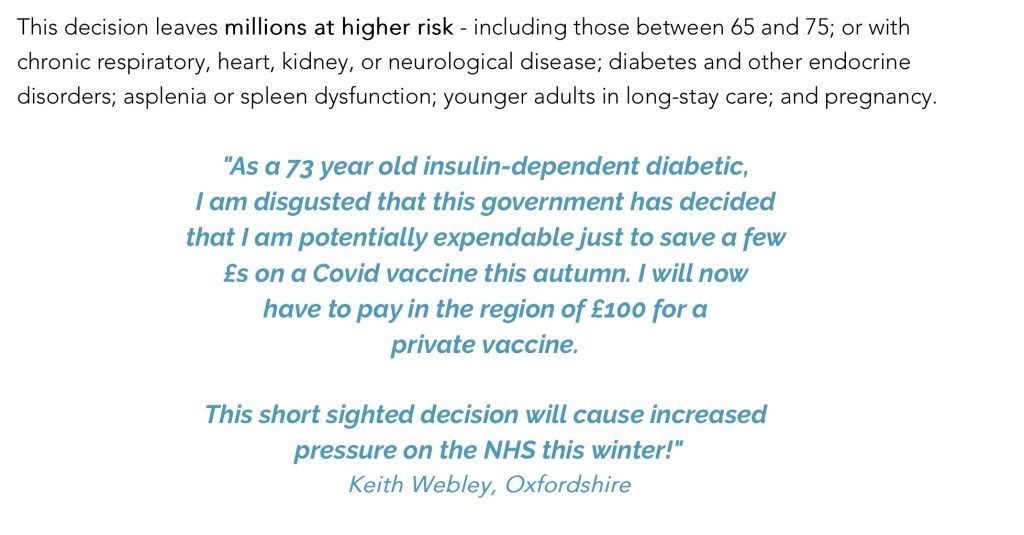 The JCVI ignores the evidence that Covid-19 remains a significant threat to the health of people, including those with severe respiratory diseases, autoimmune disorders, cardiovascular conditions, and other chronic health issues. Most of these groups will be denied an Autumn (or indeed any) boost against Covid-19.