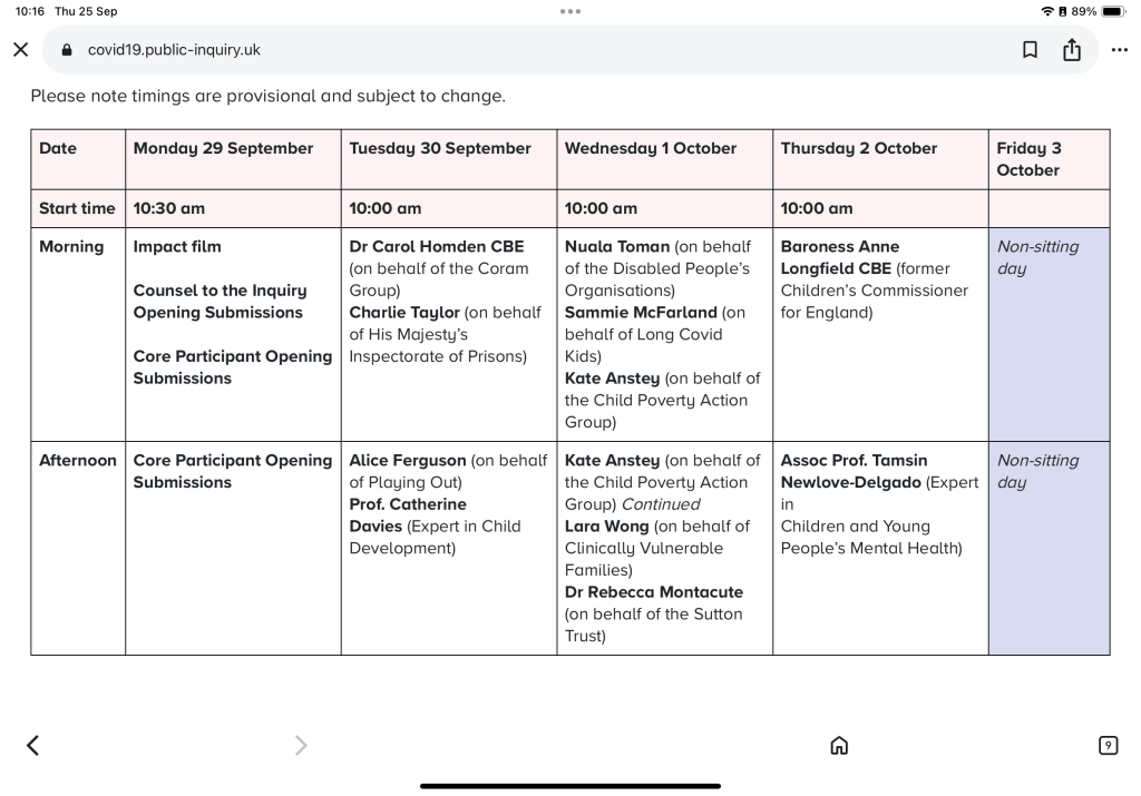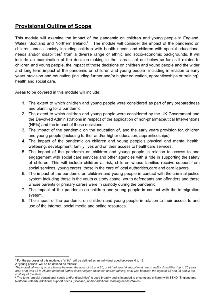 Clearly a number of areas of contention are going to emerge throughout the hearings, central to which will be the decisions made to close schools and other facilities, educational provision during closures, timing and handling of reopening, exams, and the subsequent period after so called ‘freedom day’ with the emphasis on in person attendance at school.