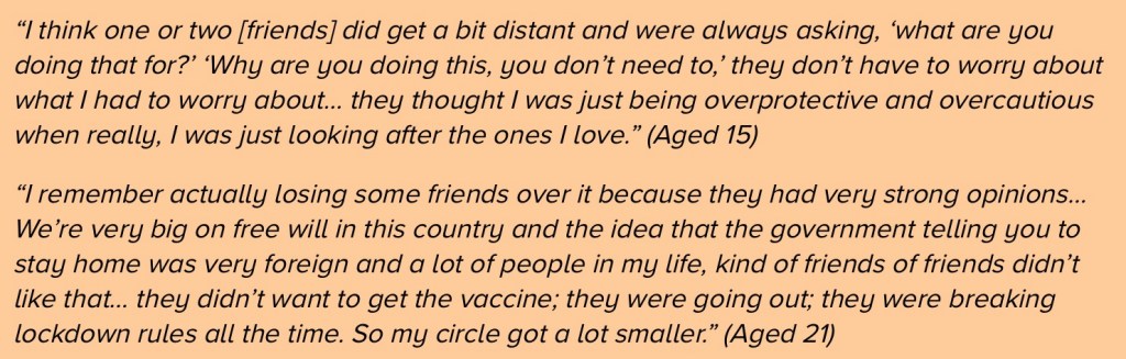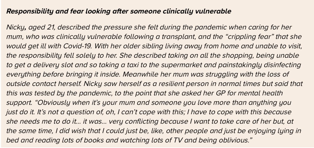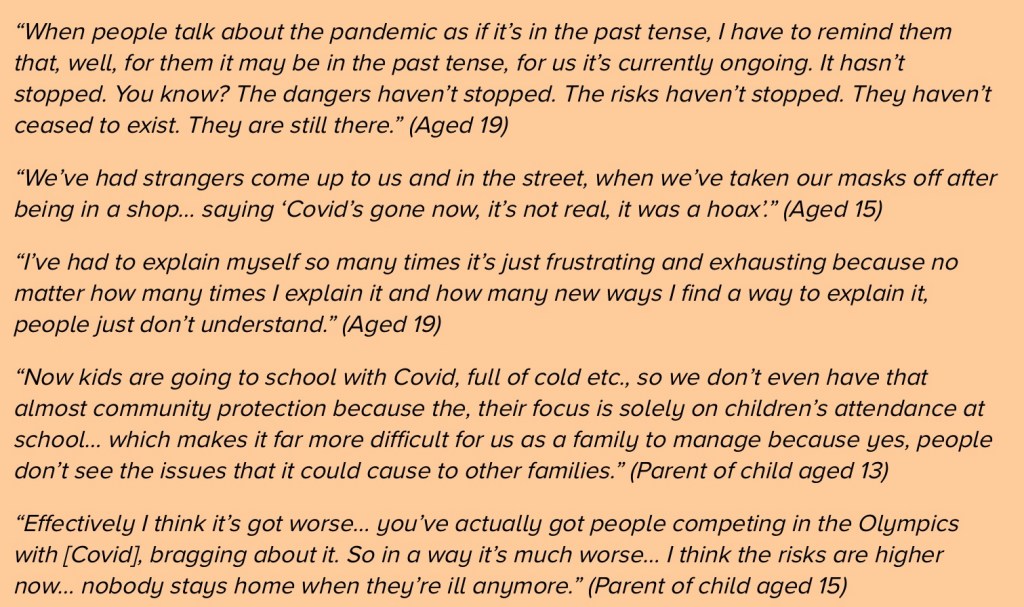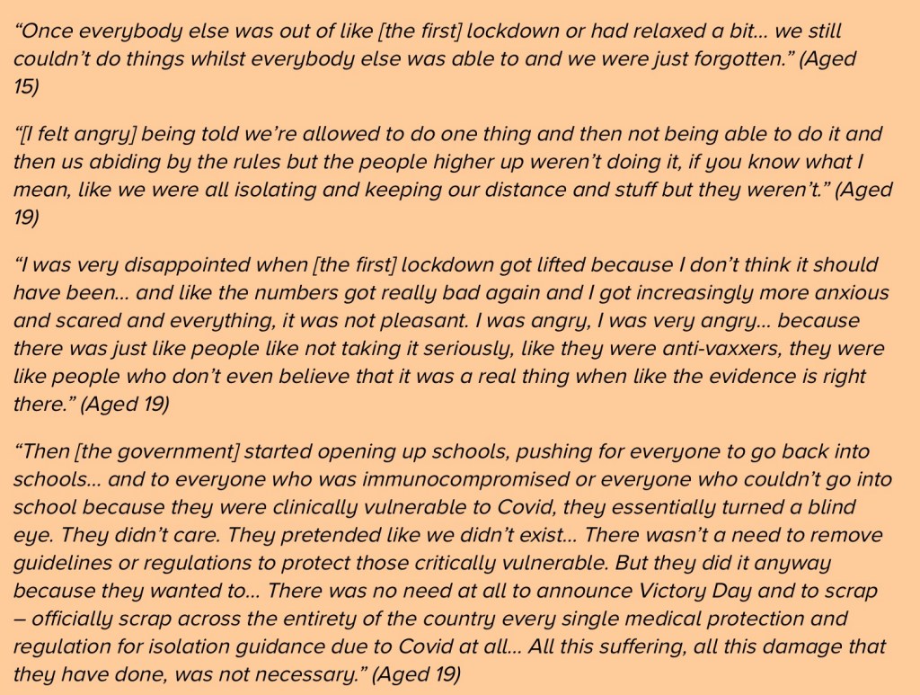 The Children and Young people’s report referred to above captures the range of experiences of a number of children impacted by clinical vulnerability including issues around isolation and stress ‘fear of killing mum’, bullying post re-opening, fines for non school attendance and enforced off-rolling from the school register – no doubt aimed at making attendance figures look good – but essentially leaving CV families to their own devices to provide education for their children. For example: