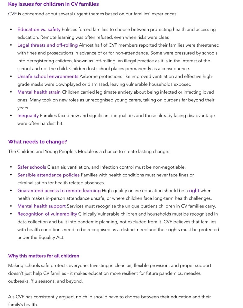 It is hoped that the inquiry will take a more nuanced approach and consider the ‘how’ questions, taking into account the failure to make schools safe, the diversity of experience across different types of children, including disabled children, children at risk of harm/ in care or living in households full of conflict, ethnic minority children, children living in unfit crowded homes or /and in poverty with lack of digital access and children who were bereaved during the pandemic. Very importantly the inquiry will hear from/about children who are themselves clinically vulnerable, and also children who live in households containing people who were/are clinically vulnerable and at increased risk from the virus. The safety of schools reopening is likely to be a central issue for this group, and also for the long covid groups and the TUC.