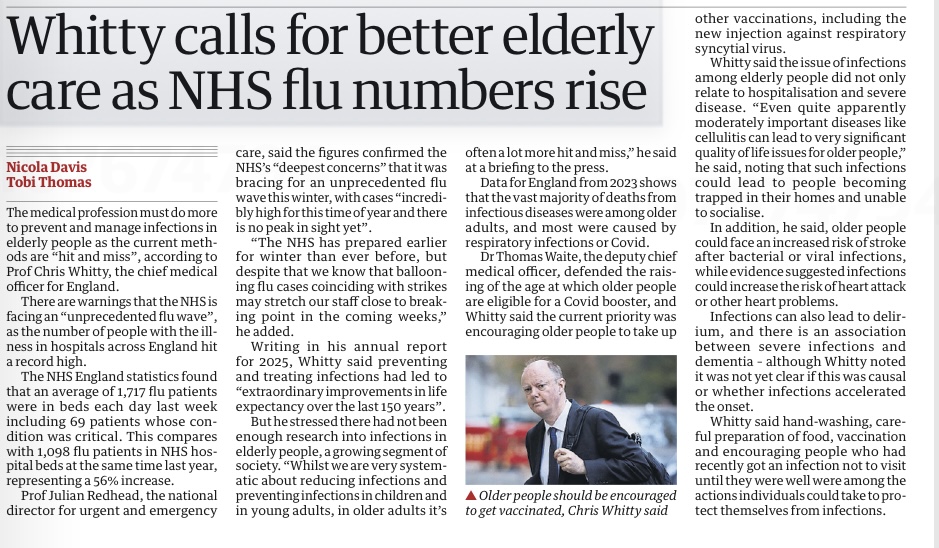 The Guardian and many other news outlets last week reported on a statement made by Chief Medical Officer, Sir Chris Whitty in which he said that not enough is being enough to prevent infections – particularly respiratory infections and Covid – amongst elderly people. The majority of deaths from infections occur among older people and infections are also known to cause a range of other health conditions including strokes and heart attacks which in term impact on the quality of life of elderly people. This is all excellent stuff.