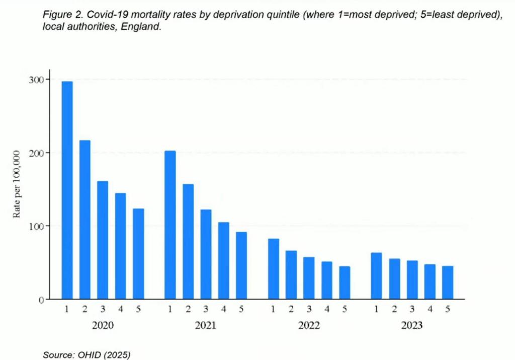 The result was large inequalities in mortality rates between deprived and non deprived areas as revealed in the following chart contained in Marmot and Bambra’s written statement . We can see how in 2020 and 2021 the most deprived fifth of areas (1) experienced far more Covid-19 deaths than other quintiles.