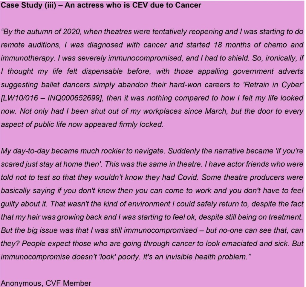 - Work, Key Workers and Finances – respondents often indicated that they felt unsafe returning to work and were often refused reasonable adjustments. This was particularly true of household members of a CV person but often also applied to clinically and CEV people themselves. Lack of safety of workplaces sometimes caused a complete withdrawal from the labour market and significant loss of income. The following quote from an actress illustrates how much many people lost due to being clinically (extremely) vulnerable – ‘the door to every aspect of public life now appeared firmly locked’.